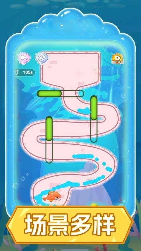 4、当小鱼没有海水滋养的时候,需按照整体的水族缸结构,确定最佳的引水计划,找到适合的路线。