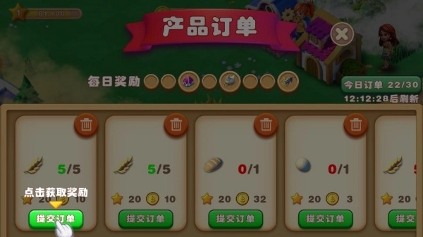 3、农作物成熟后,你可以通过订单进行出售。完成采集后,点击右下角的订单按钮即可,具体操作如图所示: