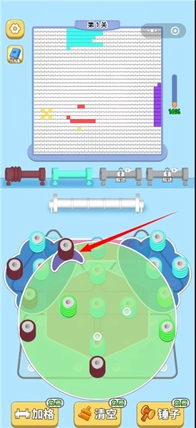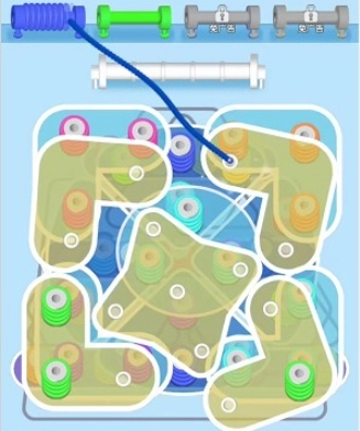 1、收集毛线:关卡分为上下两部分,下方区域分布着各色毛线团,玩家需点击对应颜色按钮,拖动毛线缠绕到相同颜色的柱子上。