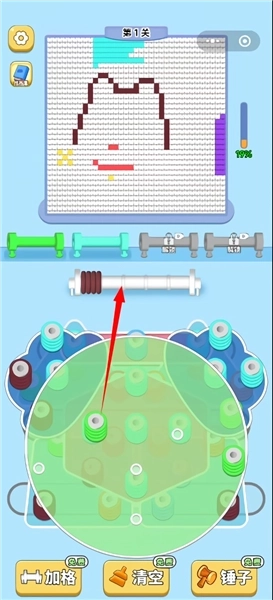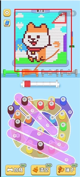 2、填充谜题:当柱子被毛线完全包裹后,系统会自动将毛线填充到上方的谜题框架中,随着游戏的进行,填充进度实时显示在屏幕上方。