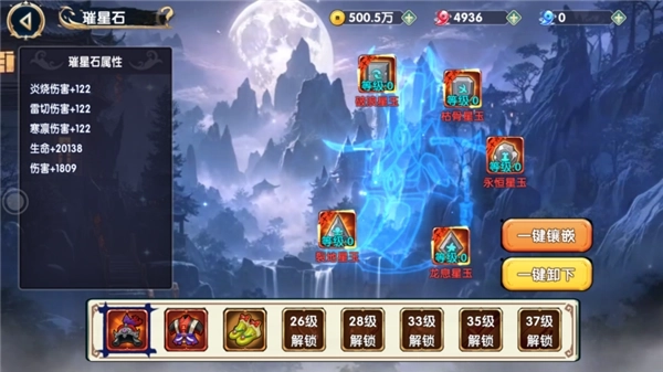 利用璀星石镶嵌系统,可以提升攻击力、生命值等各种屋性,以此提升自身战力。