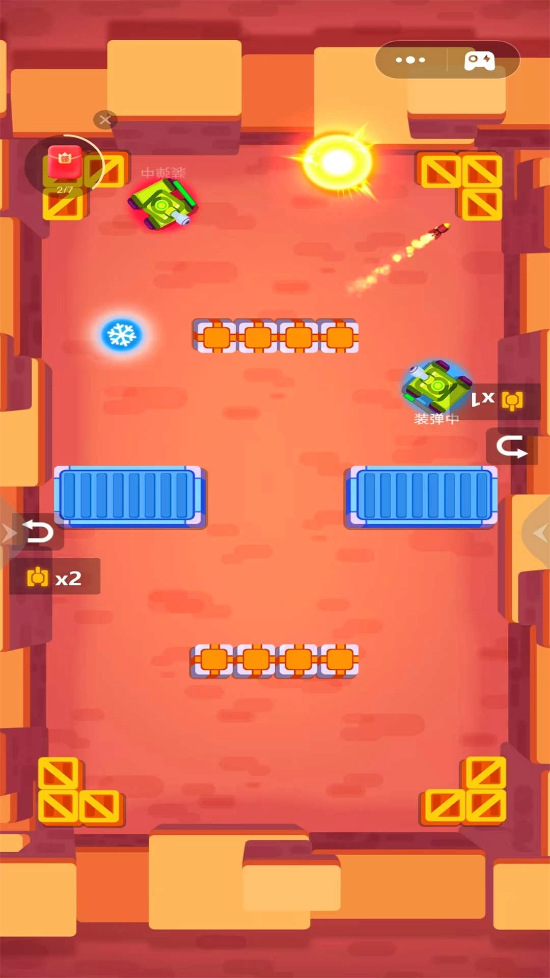 3、遇到射速快的对手时,要多利用障碍物进行迂回,让对方的炮弹撞到障碍物上白白浪费掉,同时寻找对方的破绽进行反击,抓住时间差发起攻击。
