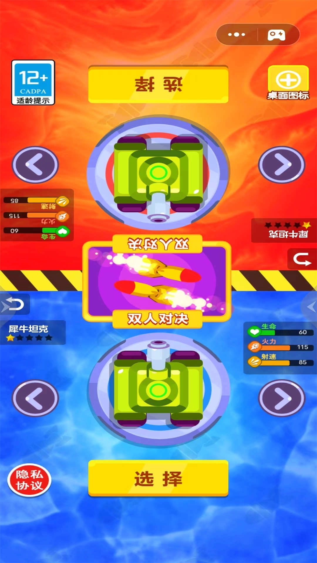3、在限定时间内,摧毁对方坦克次数更多的一方获胜。单人模式下可挑战AI,双人模式则能与好友进行实时对战。
