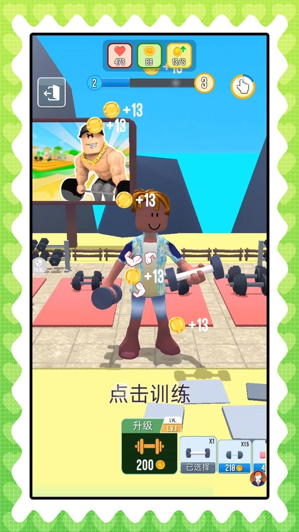 2、玩家可通过点击屏幕操控角色完成锻炼、拾取道具、释放技能等一系列动作。快速点击屏幕能够提升肌肉的增长速率,不过在此过程中需要留意点击的节奏。
