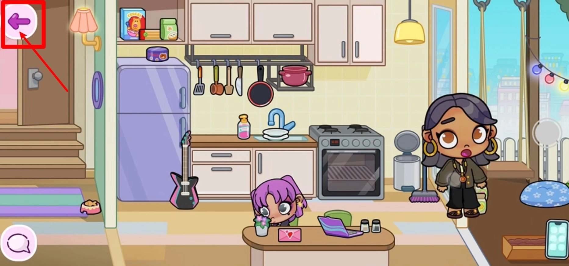 3.移动场景画面:点击左上角的紫色箭头按钮,可向左滑动切换场景区域,以便查看并进入房间左侧的连接空间或房间延伸部分。