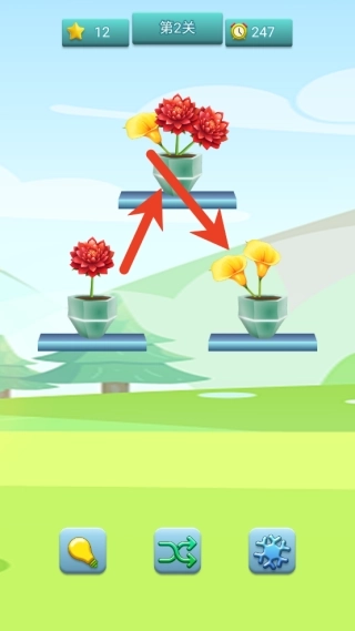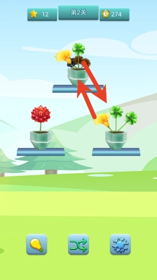 1、留意花瓶的颜色提示,把屏幕下方的花朵拖到对应色系的花瓶里,完成插花操作。
