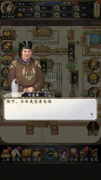2、第一步是进行上朝流程,可随机选取兵部、礼部等部门呈上的奏折进行查看,依据所选奏折的处理方式来增加或降低声望与政务数值。