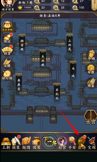 1、在游戏的主页面,点击下方的“臣将”