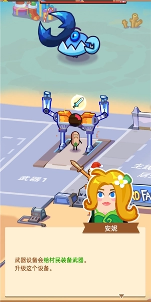 在工厂内有会有一个专业的武器设备给村民装备武器,不同的武器设备装备的英雄的职业也有所不同,而且这个武器设备是可以升级的,玩家同样是通过金币来为此进行升级,级别越高,英雄的战斗力就越高。