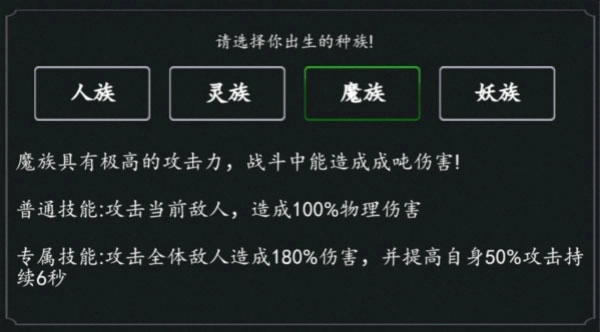 人族:中后期选手,前期会比较弱势。当有一定装备后,人族在挑战boss,有独特妙处。种族技能为沉默效果,谁用谁知道,特别中后期,大部分挑战都在比拼谁能更高效的进行技能释放。