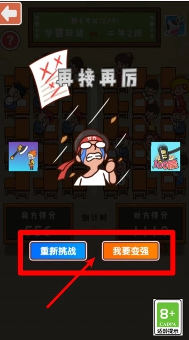 2.当挑战失败时,你可以选择“重新挑战”或者“我要变强”这两个选项。选择“重新挑战”的话,就能再次进行该关卡的挑战;而选择“我要变强”,则会进入强化界面,通过这个界面可以提升班级的整体战斗力。