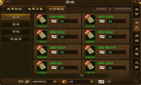 要完成交易操作,第一步得先进入主页里的商城板块,在商城中能看到杂货、拍卖、兑换等各类功能选项。找到拍卖功能后,接下来要介绍的就是今天的重点——交易系统。虽然这里叫拍卖,但实际上大部分出售行为采用的都是直接交易模式。在拍卖界面中,还能清晰看到购买、出售和公示这三个不同的分类入口。