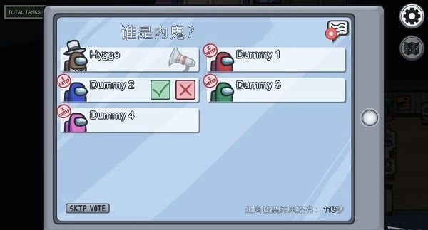 4、投票环节需依据发言中的线索进行判断,要是某个玩家被多名玩家指认,并且没办法证明自己的行动路线,那么可以优先将该玩家投出去;要是线索不够,也能够选择“SKIPVOTE”来跳过这一轮投票,防止错误地投出船员。