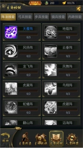 3、主角的技能共划分为五大类别,分别是阵法技能、弓兵技能、步兵技能、骑兵技能以及内政技能。