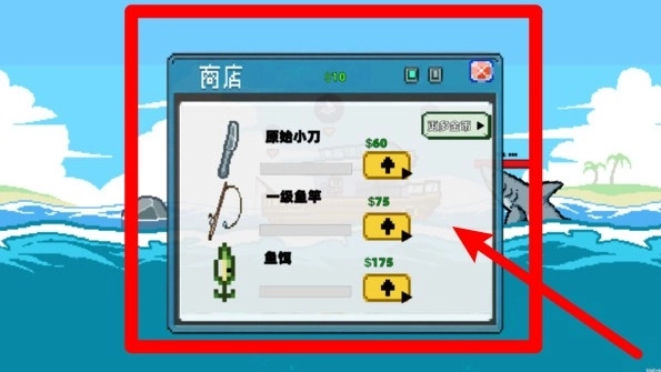 2.商店装备购买:可在商店界面购买基础小刀、鱼竿及鱼饵,通过合理使用金币提升装备等级,增强钓鱼效率和生存能力。