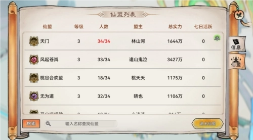 右侧的【仙盟】:可查看其它最强祖师仙盟的相关信息(等级、人数、盟主、总实力、七日活跃)