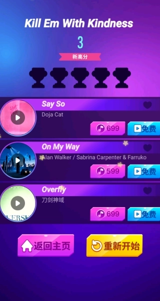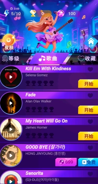 2、刚开始接触游玩时,建议优先选择难度较低的歌曲进行练习,重点关注琴块下落的节奏,以此培养手指和音乐节拍之间的配合度。