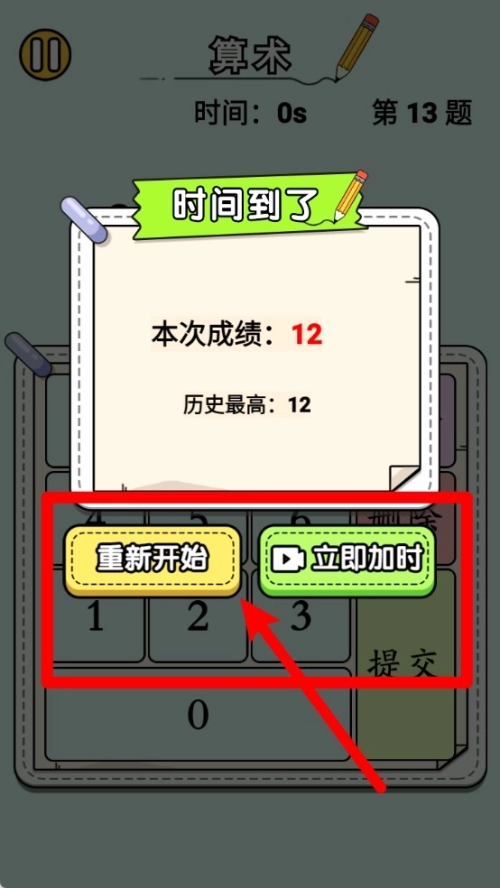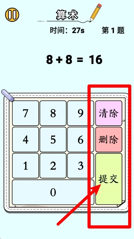 2.答题界面采用简洁直观的数字输入设计,玩家通过点击数字进行计算,并借助清除、删除和提交按钮来保证答案的准确性。