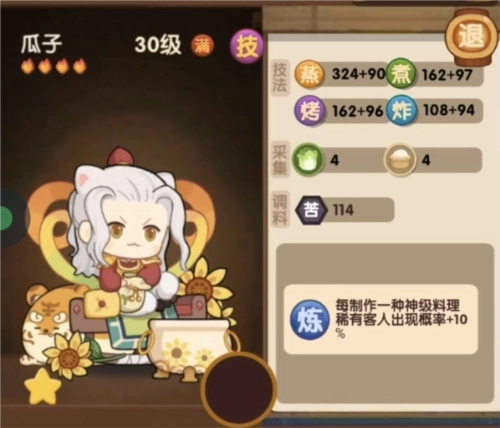 【自己每制作一道神级料理增加10%,可以做一个拉拉队,上糖番茄之类的一火菜增加贵客率,上限80%坑爹的是只有自己做才加,如果所有人都加可以封神,只自己做就有点鸡肋了,强度超过普通氪金贵客厨,但是比不上国家队,追求贵客率传统国家队要暴击有暴击要贵客率有贵客率,比丢国家队暴击更高】