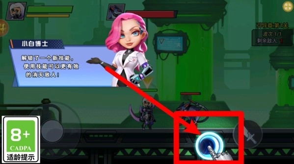 2.技能按钮提示:解锁新技能时会弹出教学提示,点击右下方技能图标即可施放技能,有效造成大量输出伤害。