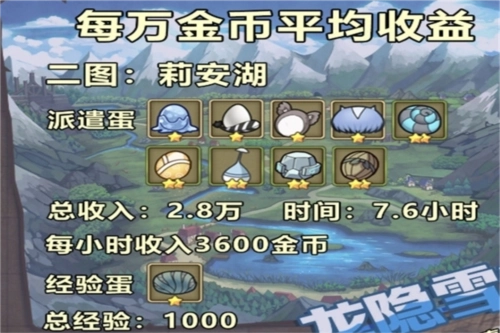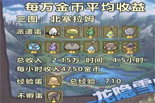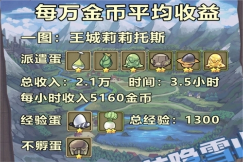 金姆姆的收益只计入总收入统计,不会算进每分钟的平均收益里,毕竟它是晚上睡觉的时候孵出来的蛋。没去孵化的蛋就相当于废蛋,迷迷可就属于这种情况——它给的金币和经验都少得可怜,与其孵它还不如去孵别的蛋。这张图的时长比较短,但收益却很高,特别适合想“爆肝”冲进度的玩家;不过要是忘了及时收蛋,那效率可就亏大了。