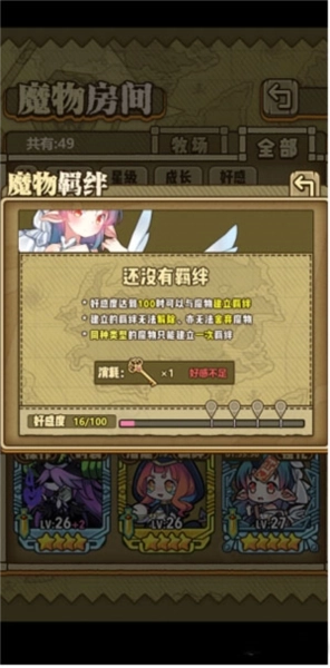 同一种类的魔物仅能挑选一只开启羁绊,开启羁绊后的魔物既不能作为狗粮喂给其他魔物,也无法派遣到远处丢弃。当玩家与魔物的好感度突破100时,魔物会解锁一期羁绊和二期羁绊,同时羁绊还会开启额外的特殊任务,完成这些任务后,玩家就能解锁更丰富的魔物剧情。