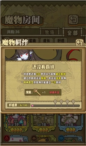 玩家选择自己已经建立好好感度的魔物,点击开启羁绊摁钮就可以开启与魔物之间的一级羁绊。玩家在和魔物建立羁绊之后就可以解锁和魔物更进一步的任务和剧情了。玩家和魔物建立羁绊之后,魔物也会有额外的属性加成,随着好感度的提升,玩家可以不断开启新的剧情和新的属性加成,喜欢的玩家不要错过。