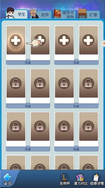 在升级按钮的上面一栏,显示当前学生的解锁课程,有锁图标则表示仍未解锁。点击锁图标,可了解解锁当前课程所需的道具,选择对应道具将会出现道具出现关卡,只要通关相应关卡即有几率获得道具奖励,解锁学生课程啦。