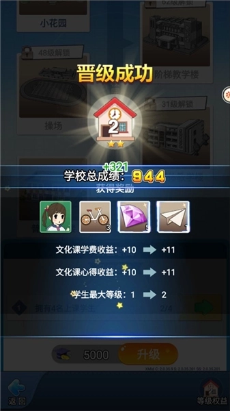 在页面最下方显示了升级所需消耗的心得数量,当拥有足量心得时,即可点击升级按钮进行升级~学生升级后,对应的学费、心得以及汗水收入也会有所提升。但需要注意的是,学生升级受学校等级的限制。所以想要培养好学生,自己的学校实力也必须要过关哟。