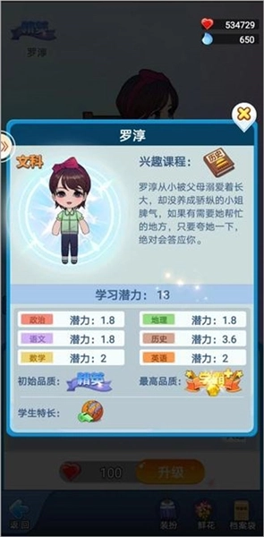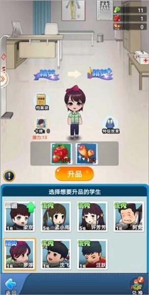 除了可以进行学生升级外,还可以通过保健室(主页面点击走廊-保健室,选择想要升品的学生)进行学生升品,实现学生的全面均衡发展。