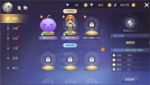 宠物也是不可忽视的一方面,通关星空之镜对应关卡后,最多能够选择3名宠物进入主战行列,还能选择6名宠物进入辅助行列。最重要的就是三名主战宠物,一定要选择SSR品级的橙色宠物,不仅技能效果好属性也很强力。在选择好宠物后还能进行等级提升,以及资质训练和升星强化。训练时只要当一条资质达到满级就能进行突破,只有不断的突破和升星,才能最终形成强悍的战斗帮手。