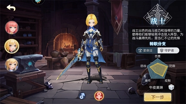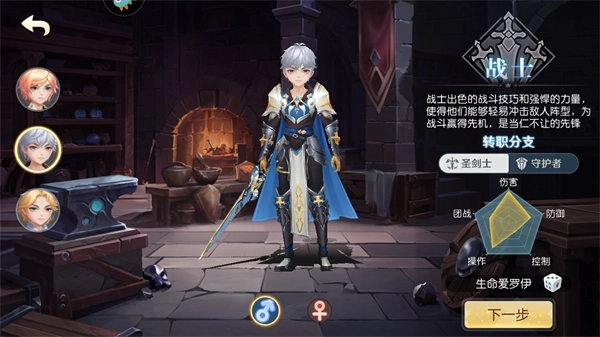 3、第二个介绍的就是战士了,分为圣剑士与守护者。圣剑士作为正义象征,不屑于使用控制技能,但其他方面都有不错的评分,如果玩家不想控制就想战斗,那么转职成为圣剑士会是一个不错的选择。