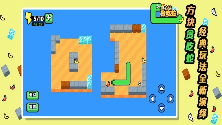 谁说贪吃蛇只能走直线?这款游戏大胆采用“方块化”的视觉风格与物理互动机制:蛇身由像素方块组成,移动时会有富有节奏感的碰撞反馈;场景会随着皮肤主题动态变化——辣椒皮肤搭配火辣的红色场景,吃鸡皮肤会有空投降落伞,推箱子皮肤则能解锁机关解谜类关卡。障碍物不再仅仅是静止的边界,而是可以推动、触发和利用的动态元素。每一局都是全新的体验,每一次刷新都充满未知的惊喜。
