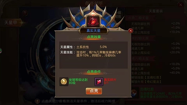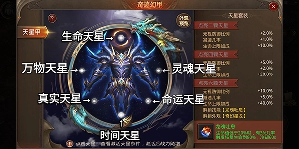 六颗天星全部点亮解锁炫酷的外观【奇幻星龙】,和强大的技能【龙魂吐息】,龙魂吐息技能:生命值低于20%时,有3%几率触发恢复生命到80%,技能冷却时间为60秒。