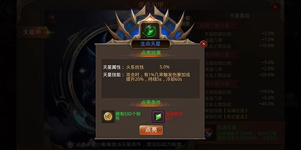 生命天星属性为:火系抗性5.0%