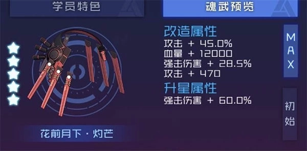 3、魂武系统对学员的帮助也很大,每个学员都有自己的专属魂武。魂武可以通过改造和升星提高自己的属性,比如说次元魔方爱丽丝的魂武是次元魔方神蚀。次元魔方神蚀的初始改造属性和升星属性只有百分之五的攻击力加成,而将次元魔方升到满级,就可以获得百分之四十五和百分之二十的攻击加成,还有各种血量、加伤等等的提升。魂武的升星需要一把相同的魂武,目前可以通过魂卡商店和竞技商店换取,相对来说魂卡商店要划算一点,5张魂卡就能换取一把魂武,也就是20张魂卡就能让魂武升星毕业。