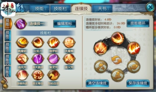 每个玩家可以学习多个技能,但是主界面的每个技能栏只有4个格子,通过【连续技】系统来实现玩家用四个技能栏的位置释放超过4个技能,每个连续技有六个格子,可以将人物技能和法宝技能(XP技不能放入其中)放入其中,格子的数字对应释放的顺序,同一个技能可以多次放入其中。