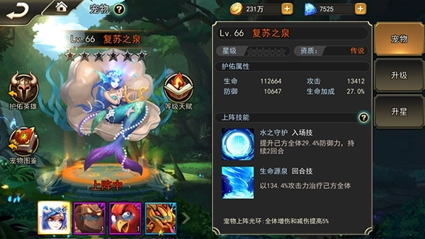 1、复苏之泉,金色宠物,入场提升己方全体防御力,持续两回合;回合技是治疗己方全体。这个宠物非常适合无奶的阵容,为团队提供续航能力。