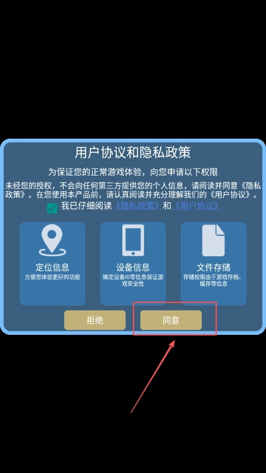 1、打开游戏后,先看到游戏协议,点一下同意就行啦,这是使用前的必要步骤,很快就能完成,不用多想的哦。