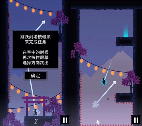 1、玩家跳跃时若手势滑动不当,可能无法快速上升,甚至会向下坠落。此时需在半空中及时调整忍者的前进方向,引导他移动至更高处。