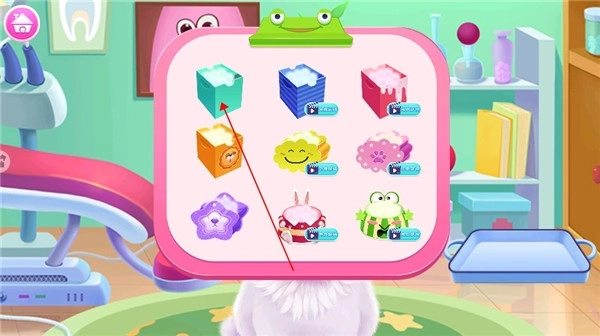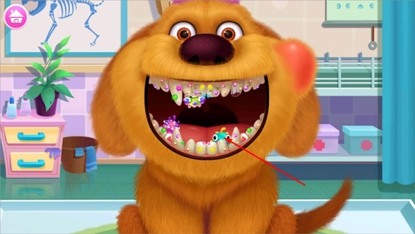 1、启动游戏,进入宠物医院场景,第一步要为贪吃的狗狗治疗蛀牙问题。