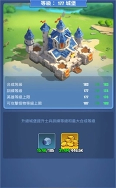 2、点击进入后使用金币和石块可以升级自己的城堡,更好的城堡可以获得更好的英雄和防御塔。