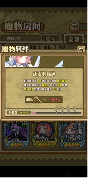 同一种类的魔物只能选择一只开启羁绊,开启羁绊之后的魔物不可以喂养给其他魔物当狗粮,也不可以派遣到远处丢弃。当玩家的好感度超过100后,魔物还会开启一期羁绊和二期羁绊,羁绊还会开启额外的特殊任务,完成任务之后玩家可以收获更丰富的魔物剧情。