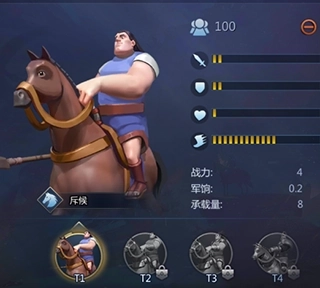 1、游戏里有4种兵种,分为布兵(肉盾)、弓兵(高攻击力)、骑兵(高移速)、攻城器械(运输资源效率高);不同兵种的攻击、生命、防御、速度有所不同;同一兵种阶数越高属性也会越高;