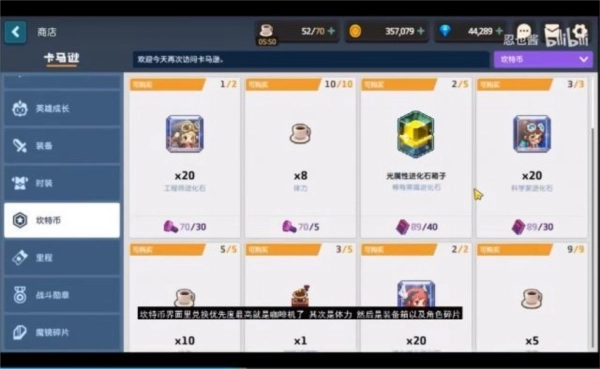 坎特币界面里,兑换优先度最高就是咖啡机了,其次是体力,然后是装备箱以及角色碎片。只要我们把普通关卡以及噩梦关卡当中的坎特币全部收集,是足够兑换光坎特币商店的。咖啡机的话我们收集5个咖啡机,在我们体力旁边会有一个咖啡豆标志,点一下的话会把我们的体力回满并提高体力上限。这点大家一定要注意一下,不要满体力时使用咖啡豆,会很亏体力的。