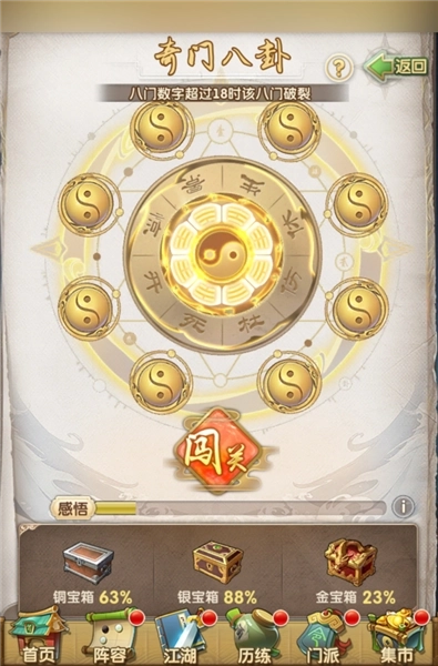 2、首先,掌门需要达到65级,方可在门派中发现一处二十八星宿奇阵,前往便能够破阵并参悟奇门遁甲之道。而最为基础的奇门八卦共分八门,分别为开门、死门、杜门、伤门、休门、生门、景门、惊门。奇门八卦之中蕴含阴阳双九野之理,故八门星数均不可超过双九之数。掌门可在破阵过程中,随时收取八门星数,当八门星数足够时,便可开启奇门八卦中的宝藏,宝藏中藏有蕴含星宿之力的各色奇石,于掌门修行而言有极大用处。另外,破阵同时,掌门可通过收取八门星数获得感悟,感悟达到一定程度时,可获得遁甲符。