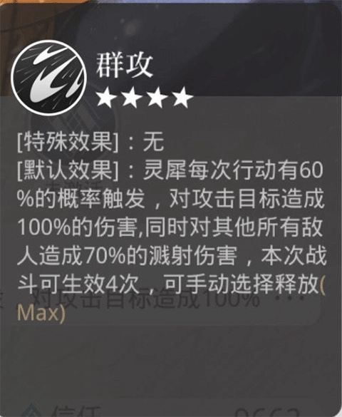 (1)群攻:群体伤害,属于一次性造成的伤害效果,有概率触发,且在一局游戏中最多能触发4次。