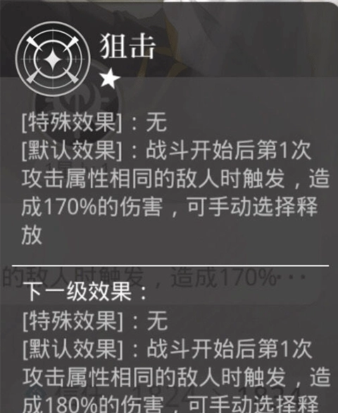 (4)狙击:当遭遇相同属性的情况下会触发该效果,触发后造成一次基于百分比的伤害,此效果在触发次数上没有限制。