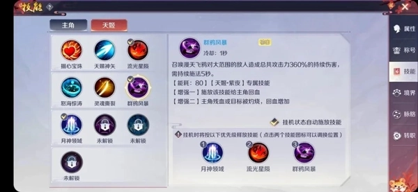 月神领域可以固定不变,后面两组技能在打斗过程中切换,至于什么时候换技能,也挺简单,进去直接切换技能页面,打开声音,天姬放技能时会喊技能名,技能名喊完直接换下一个技能就行。
