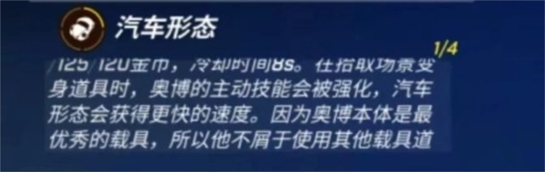 奥博是目前唯一一个可以在局内完成自身形态变化的追捕,那么他的技能是什么呢?主动天赋-汽车形态:奥博可以切换为汽车形态持续8S,消耗140/135/125/120金币,冷却时间8S。在拾取场景变身道具时,奥博的主动技能就会获得强化,汽车形态会获得更快的速度,因为奥博本体是最优秀的载具,座椅他不屑使用其他载具道具卡。这个技能相当于直接让奥博多了一张载具卡,也是特别适合速刷或者是拖人。